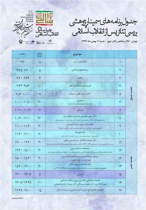 سمینار پژوهشی «بررسی تئاتر پس از انقلاب اسلامی» به همت دبیرخانه‌ سی و هفتمین جشنواره‌ی بین‌المللی تئاتر فجر برگزار خواهد شد.