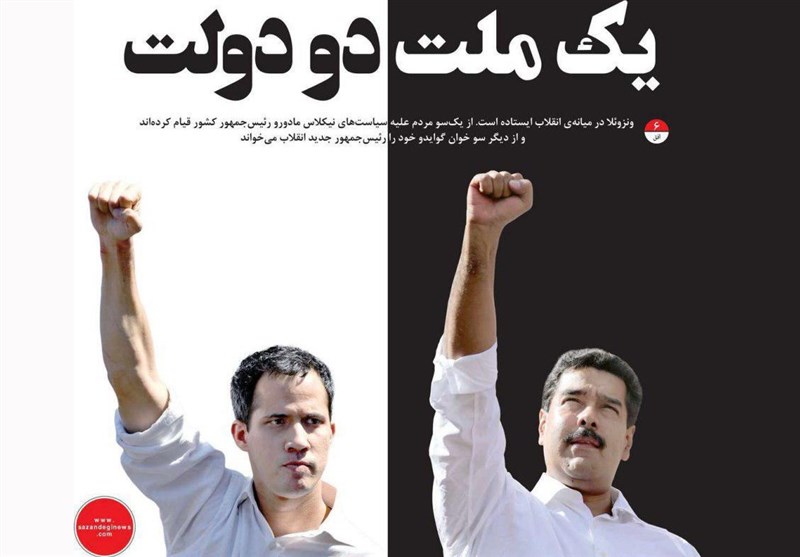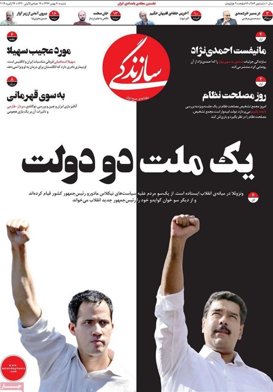 روزنامه سازندگی نزدیک به اصلاحطلبان اعتراضات حامیان کودتا در ونزوئلا علیه رئیس جمهور قانونی این کشور را "قیام مردم" دانسته و خوان گوایدو رهبر کودتاچیان که مورد حمایت آمریکاییها قرار گرفته را با تیتر "یک ملت دو دولت" دولت خوانده است