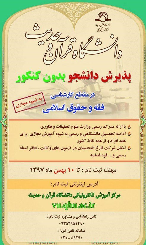 به گزارش خبرنگار فرهنگی باشگاه خبرنگاران پویا، دانشگاه قرآن و حدیث اقدام به پذیرش دانشجو در رشته فقه و حقوق اسلامی در مقطع کارشناسی بهشیوه مجازی کرده است.