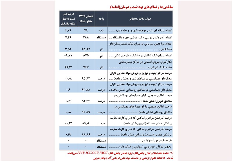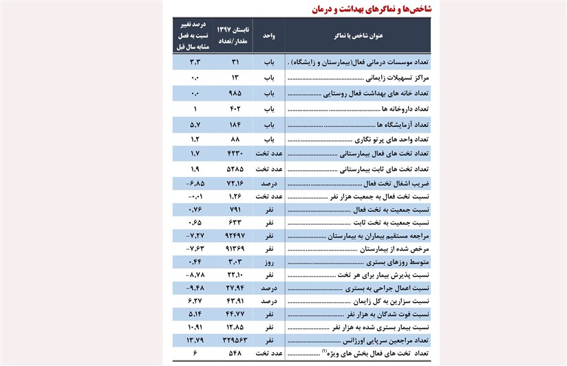 با این مقدمه بررسی آخرین وضعیت شاخصها و نماگرهای بخش بهداشت و درمان آذربایجان غربی با نگاهی به جدول فوق تأمل برانگیز است چرا که آنجا که نیاز به توسعه و تأمین زیرساختهای بهداشت و درمان بوده اعداد و نماگرها به ندرت حرکت رو به جلو نشان میدهند کما اینکه تعداد مؤسسات درمانی فعال از جمله بیمارستان و زایشگاه فقط 3.3 درصد رشد داشتهاند در عین حال مراکز تسهیلات زایمانی یا تعداد خانههای بهداشت فعال روستایی اصلاً هیچ ارتقائی در این یک سال نداشتهاند اگر چه تعداد کل تختهای بیمارستانی افزایش 1.9 درصدی را نشان میدهد.