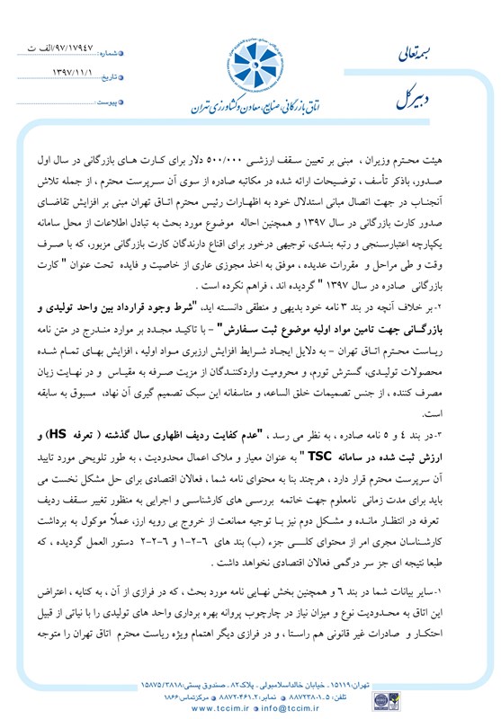 وی در این نامه به مصوبه هیات وزیران مبنی بر تعیین سقف ارزشی 500 هزار دلار برای کارتهای بازرگانی در سال اول صدور، اشاره کرده و آورده است:« توضیحات ارائه شده در مکاتبه صادره از سوی آن سرپرست محترم، از جمله تلاش آنجناب در جهت اتصال مبانی استدلال خود به اظهارات رییس محترم اتاق تهران مبنی بر افزایش تقاضای صدور کارت بازرگانی در سال 1397 و همچنین احاله موضوع مورد بحث به تبادل اطلاعات از محل سامانه یکپارچه اعتبارسنجی و رتبهبندی، توجیهی درخور برای اقناع دارندگان کارت بازرگانی مزبور، که با صرف وقت و طی مراحل و مقررات عدیده، موفق به اخذ مجوزی عاری از خاصیت و فایده تحت عنوان کارت بازرگانی صادره در سال 1397 شده ند، فراهم نکرده است.»