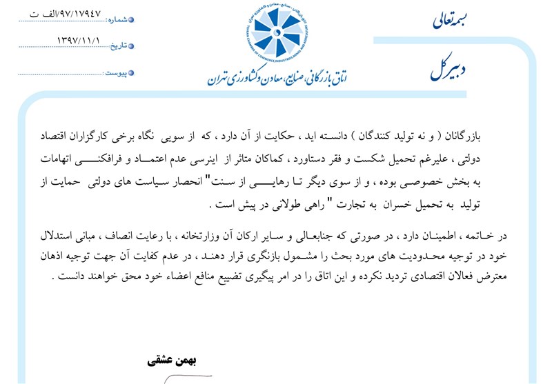 وی در پایان نامه خود آورده است: «در خاتمه، اطمینان دارد، در صورتی که جنابعالی و سایر ارکان آن وزارتخانه، با رعایت انصاف، مبانی استدلال خود در توجیه محدودیتهای مورد بحث را مشمول بازنگری قرار دهند، در عدم کفایت آن جهت توجیه اذهان معترض فعالان اقتصادی تردید نکرده و این اتاق را در امر پیگیری تضییع منافع اعضا خود محق خواهند دانست».