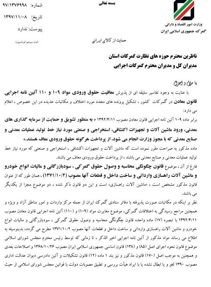 به گزارش خبرنگار اقتصادی خبرگزاری تسنیم، معاون فنی گمرک ایران در بخشنامه ای به گمرکات اجرایی با اشاره به وجود سلیقه ای از پذیرش معافیت حقوق ورودی مواد 109 و 11 آیین نامه اجرایی قانون معادن در گمرکات کشور  و تشکیل پرونده های متعدد اختلافی همچنین مکاتبات عدیده،  به منظور تشویق و حمایت از سرمایه گذاری های صنایع معدنی، ورود ماشین الات و تجهیزات اکتشافی مورد نیاز خطوط تولید که با مجوز وزارت خانه مربوطه انجام میشود، از پرداخت هرگونه حقوق ورودی معاف میباشند.