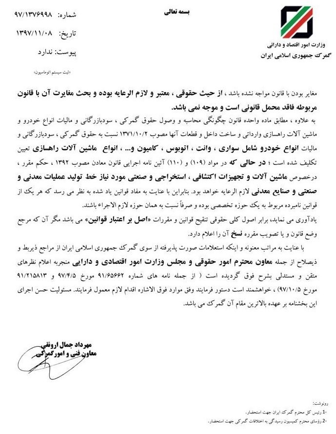 معاون فنی گمرک در بخشنامه ای بر معافیت حقوق ورودی ماشین آلات معدنی و تجهیزات اکتشافی مورد نیاز خطوط تولید تاکید کرد.
