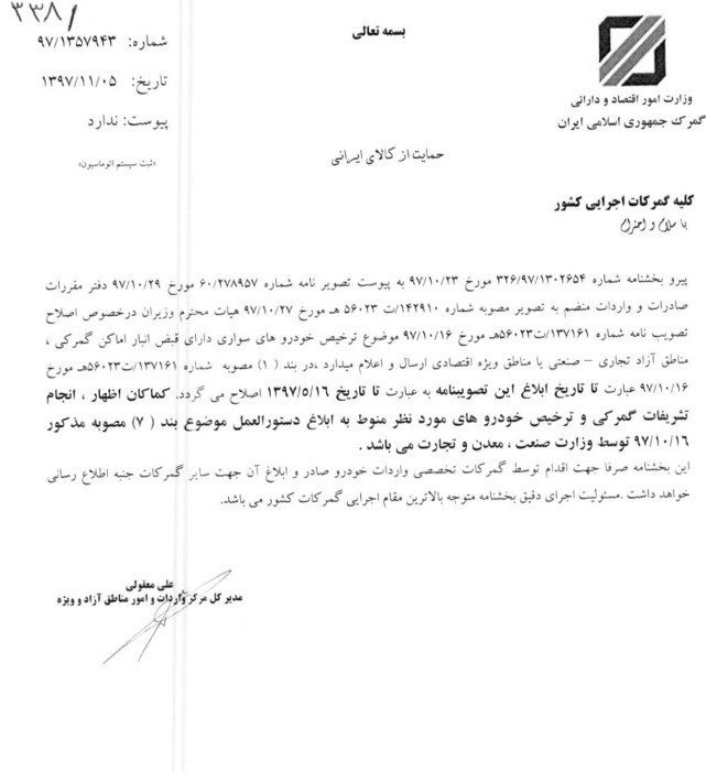 بر اساس  ابلاغیه دفتر واردات گمرک ایران ترخیص خودروهای سواری واردشده دارای ثبت سفارش تا تاریخ 16 مرداد ماه بلامانع می‌باشد، این درحالی است که بخشنامه تأکید دارد ترخیص خودروهای مذکور همچنان منتظر ابلاغ دستورالعمل بند 7 مصوبه دولت توسط وزارت صنعت است.