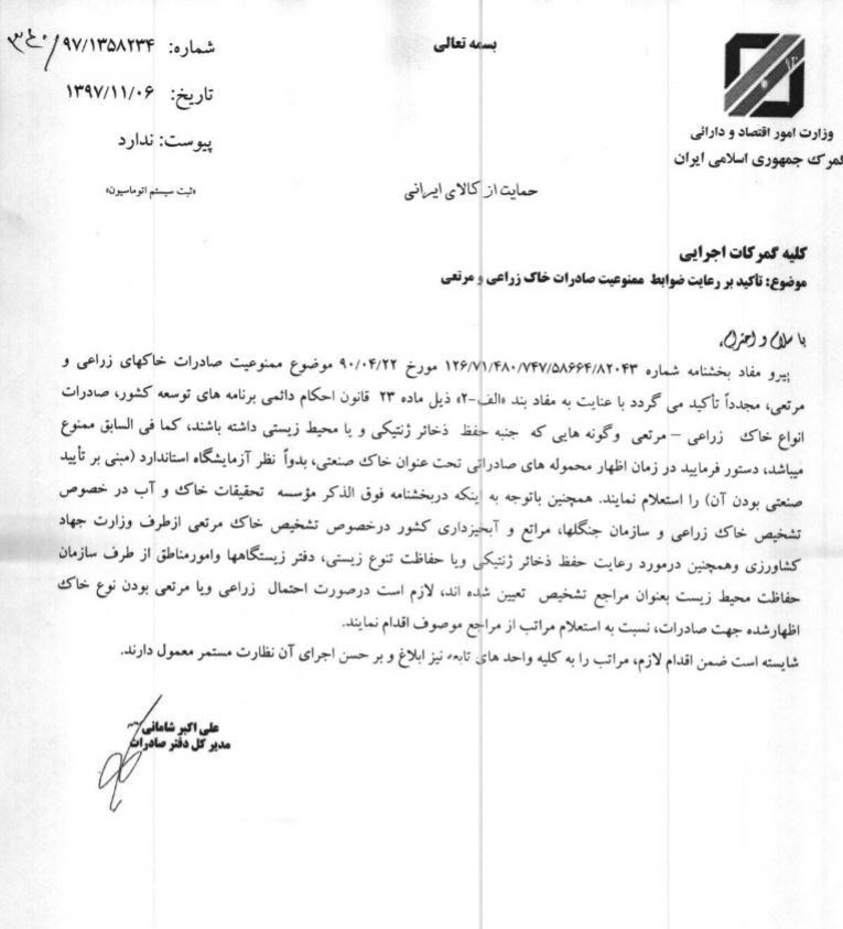 به گزارش خبرنگار اقتصادی خبرگزاری تسنیم، به دنبال بخشنامه اخیر گمرک کشور، با تاکید مجدد بر ممنوعیت صادرات خاک زراعی و مرتعی که جنبه ذخائر ژنتیکی و یا محیط زیستی دارند، صادرات انواع خاک صنعتی از کشور منوط به انجام آزمایشها و نظر آزمایشگاه استاندارد مبنی بر صنعتی بودن خاک صادراتی است.