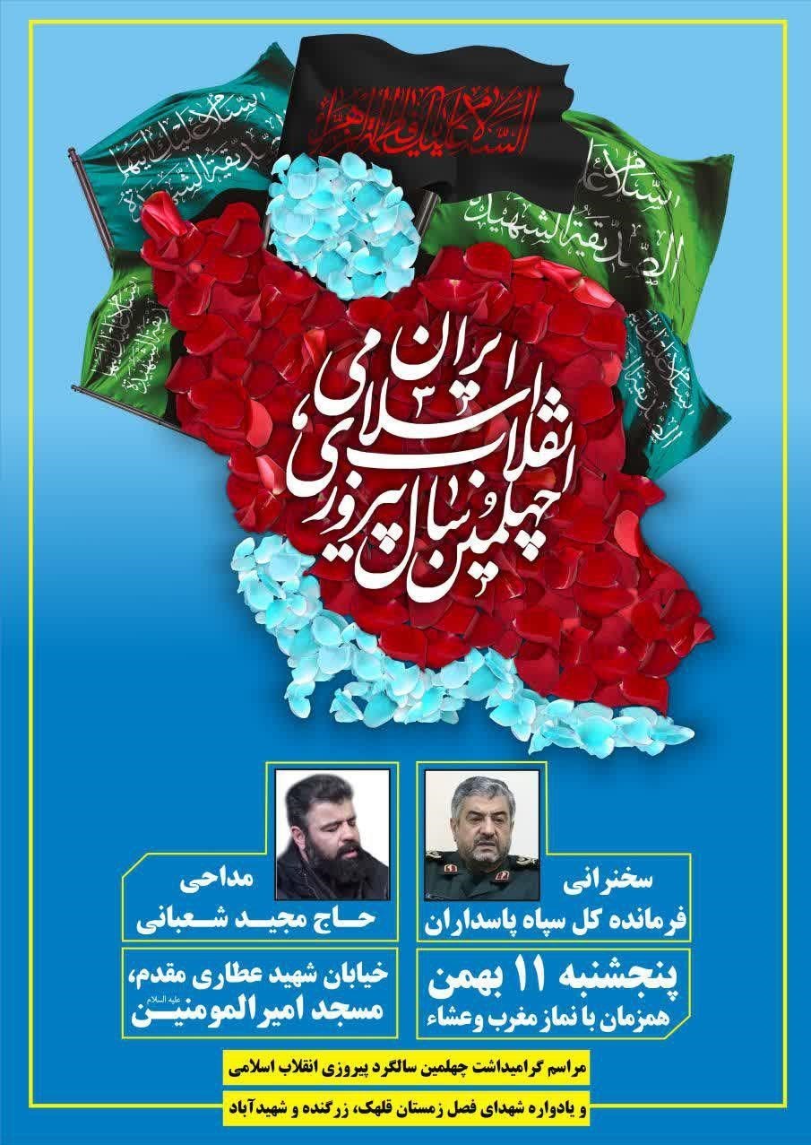 به گزارش خبرنگار دفاعی خبرگزاری تسنیم، مراسم بزرگداشت چهلمین سالگرد پیروزی انقلاب اسلامی، پنجشنبه 11 بهمن بعد از نماز مغرب و عشا با سخنرانی سرلشکر "محمدعلی جعفری"، فرمانده کل سپاه پاسداران انقلاب اسلامی، در مسجد امیرالمومنین (ع) قلهک (خیابان شهید عطاری مقدم) برگزار میشود.