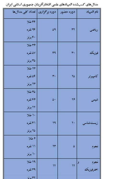 در جدول زیر مدالهای المپیادهای جهانی علمی که توسط دانش آموزان ایرانی کسب شده است را مشاهده میکنید.