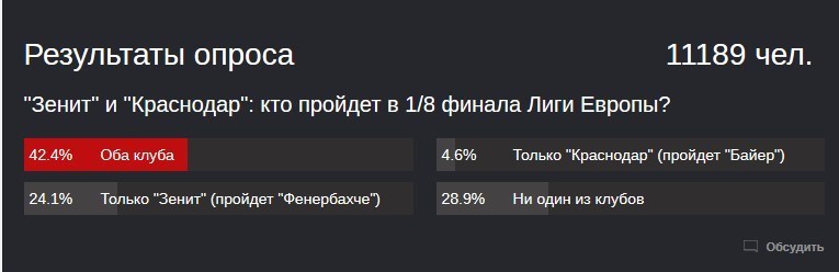 به گزارش خبرگزاری تسنیم، سایت اسپورت اکسپرس روسیه درباره میزان شانس صعود 2 نماینده این کشور در بازیهای مرحله یکشانزدهم نهایی لیگ اروپا شامل تیمهای زنیت سنپترزبورگ و کراسنودار برگزار کرد. در این نظرسنجی گزینه صعود هر 2 تیم از این مرحله با آرای 42.4 درصدی کابران مواجه شد. گزینه صعود فقط تیم زنیت سنپترزبورگ 24.1 درصد آرا را به دست آورد. 4.6 درصد شرکتکنندگان در این نظرسنجی به گزینه فقط صعود تیم کراسنودار رای دادند. گزینه عدم صعود هر 2 تیم زنیت سنپترزبورگ و کراسنودار آرای 28.9 درصد را به خود اختصاص داد.