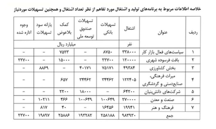 خلاصه اطلاعات برنامه‌های مذکور از نظر تعداد اشتغال و منابع و تسهیلات مالی موردنیاز برای انجام برنامه از محل منابع بانکی و منابع صندوق توسعه ملی، کمک‌های بلاعوض، یارانه نرخ سود تسهیلات و وجوه اداره شده به شرح جدول زیر است.