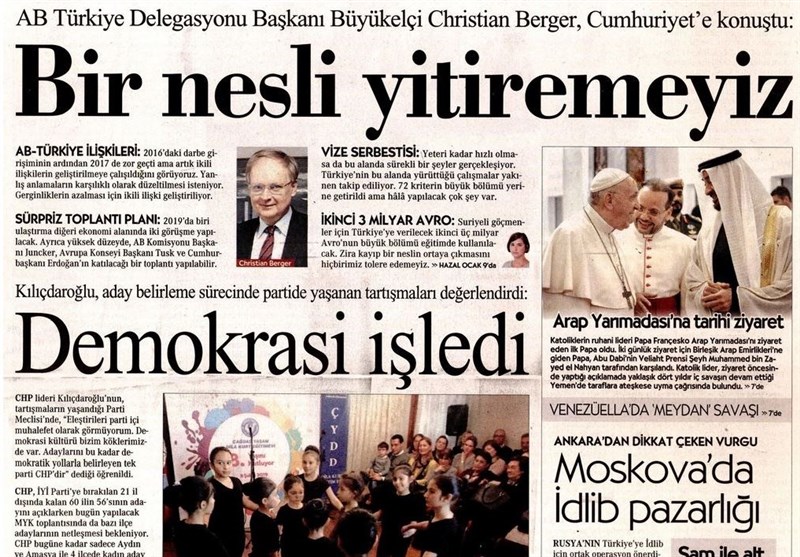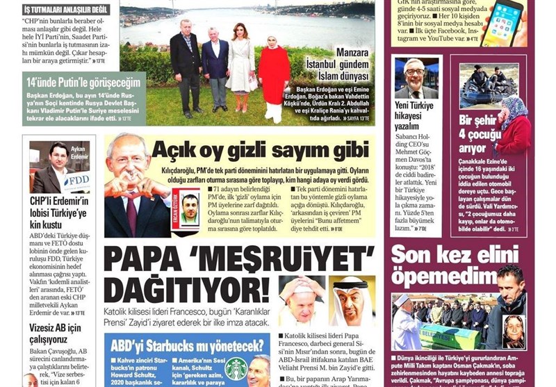 به گزارش گروه بین‌الملل خبرگزاری تسنیم، بسیاری از روزنامه‌های ترکیه، امروز در عکس و تیتر صفحه نخست، اظهارات تند اردوغان علیه حزب دموکراتیک خلق‌ها را برجسته کرده‌اند. همچنین این روزنامه‌ها موضوعات دیگری مانند اهداف آمریکا در ونزوئلا و سفر پاپ به امارات را مورد توجه قرار دادند.