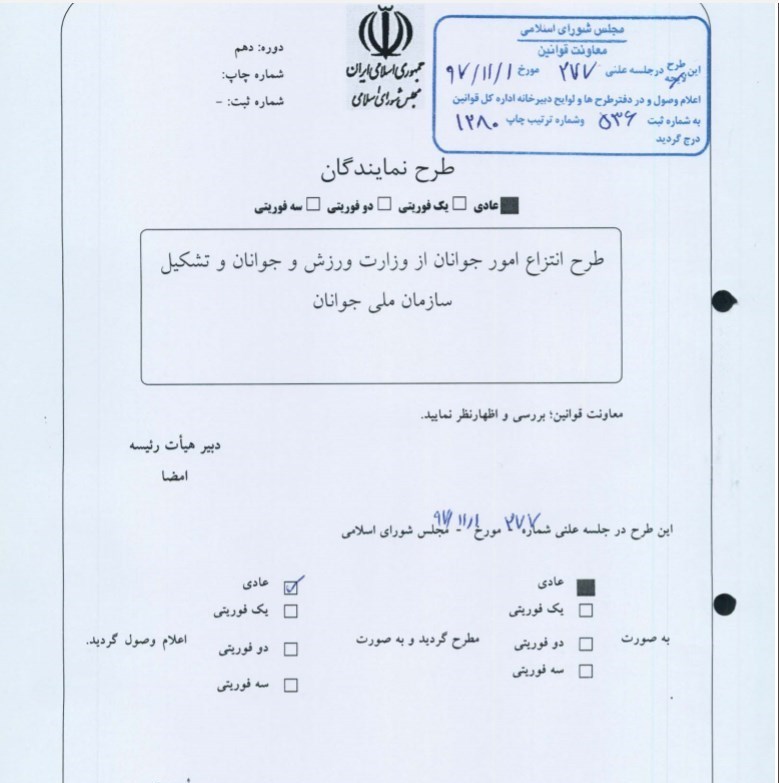 به گزارش خبرنگار پارلمانی خبرگزاری تسنیم، طرح تشکیل "سازمان ملی جوانان و انتزاع اختیارات و وظایف این سازمان از وزارت ورزش و جوانان" با امضای بیش از 80 تن از نمایندگان مجلس در جلسه علنی روز یکم بهمن پارلمان از سوی هیئترئیسه قوه مقننه اعلام وصول شد.