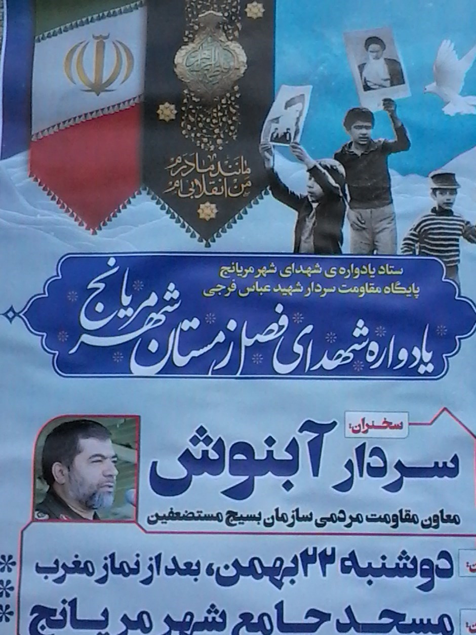 یادواره شهدای فصل زمستان شهر شهیدپرور مریانج در چهلمین سالروز پیروزی انقلاب اسلامی و با سخنرانی ‌سردار آبنوش، معاون مقاومت مردمی سازمان بسیج برگزار می‌شود.