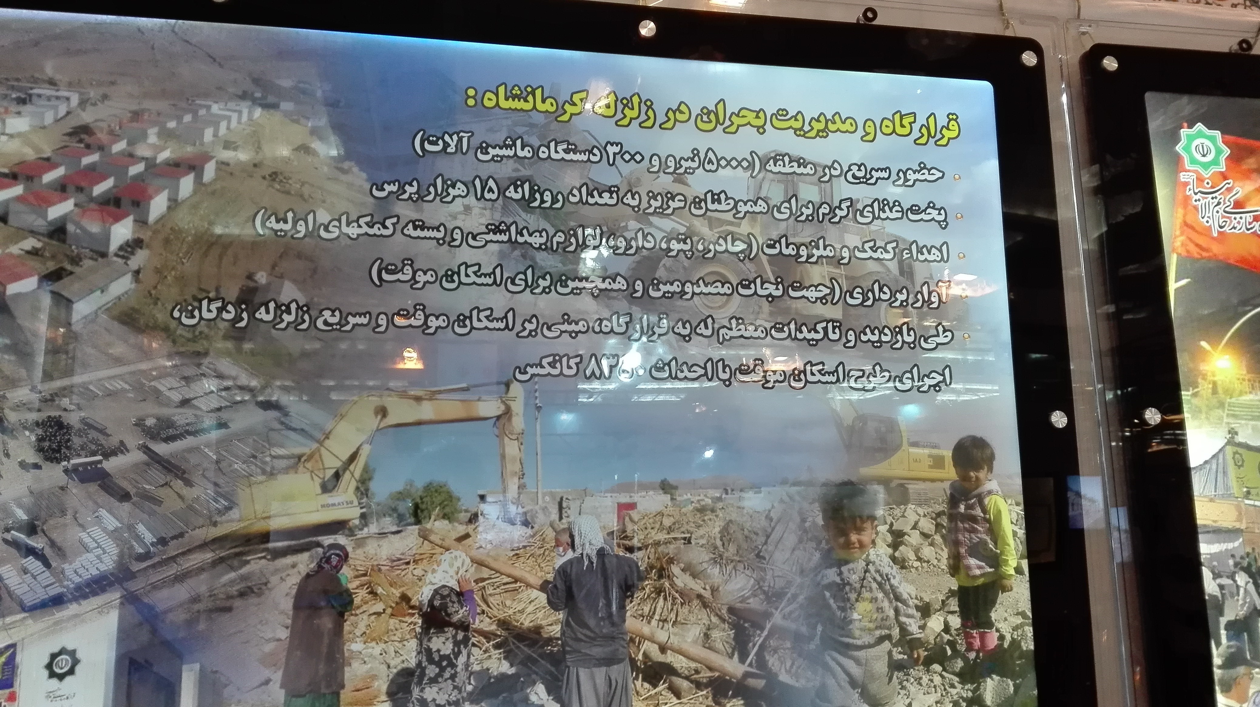 در بخش دیگری از این نمایشگاه به حضور تمامی نیروهای عملیاتی قرارگاه در پروژههای مختلف عمرانی در زمان وقوع زلزله کرمانشاه و امدادرسانی به زلزلهزدگان اشاره شده بود.