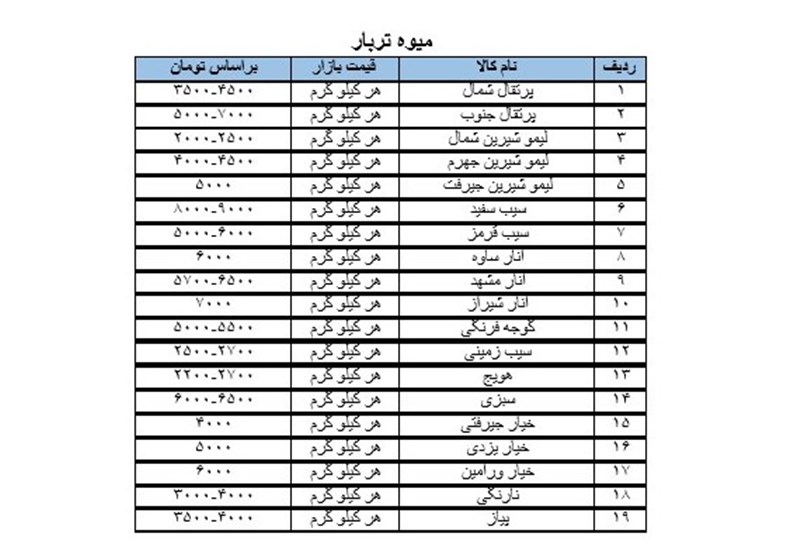 خبرگزاری تسنیم به صورت هفتگی قیمت میوه، تره بار، حبوبات، مواد پروتئینی و سایر اقلام را در سطح شهر ارومیه منتشر می‌کند.