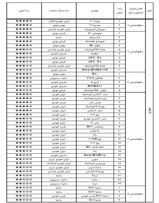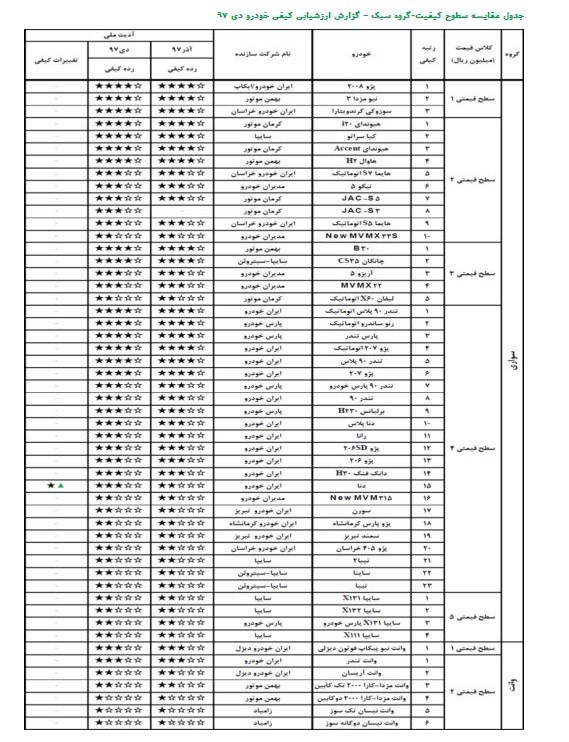 در سطح قیمتی 1 خودروهای پژو 2008 ، نیو مزدا 3 و گرند ویتارا، در سطح قیمتی 2 خودروهای هیوندای 20i ، کیا سراتو ، هیوندای Accent و هاوال 2H، در سطح قیمتی 3 خودروهای30B و چانگان 35cs، در سطح قیمتی 4 خودروهای تندر 90 پلاس اتوماتیک، رنو ساندرو اتوماتیک، پارس تندر، پژو 207 اتوماتیک، تندر 90 پلاس و پژو 207با اخذ 4 ستاره کیفی بالاترین کیفیت خودروهای تولیدی ساخت داخل را در این ماه به خود اختصاص دادند.