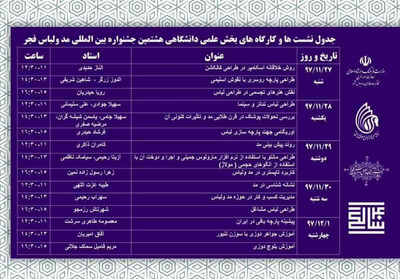 همچنین جدول نشست ها و کارگاههای بخش علمی و دانشگاهی مد و لباس فجر از سوی دبیرخانه این جشنواره به شرح زیر اعلام شد: