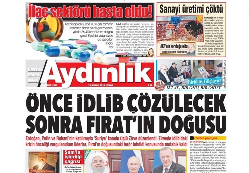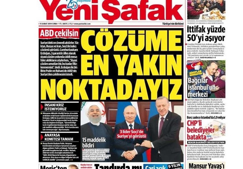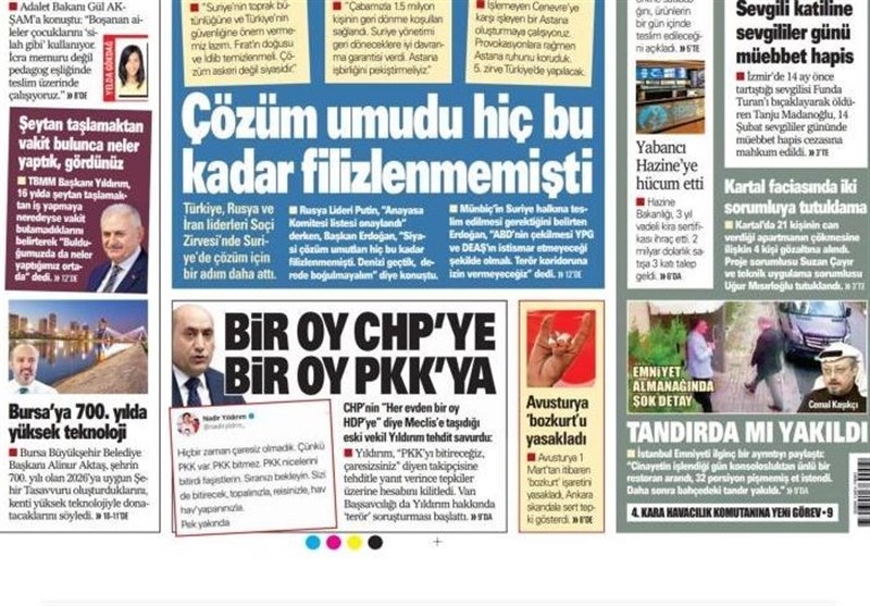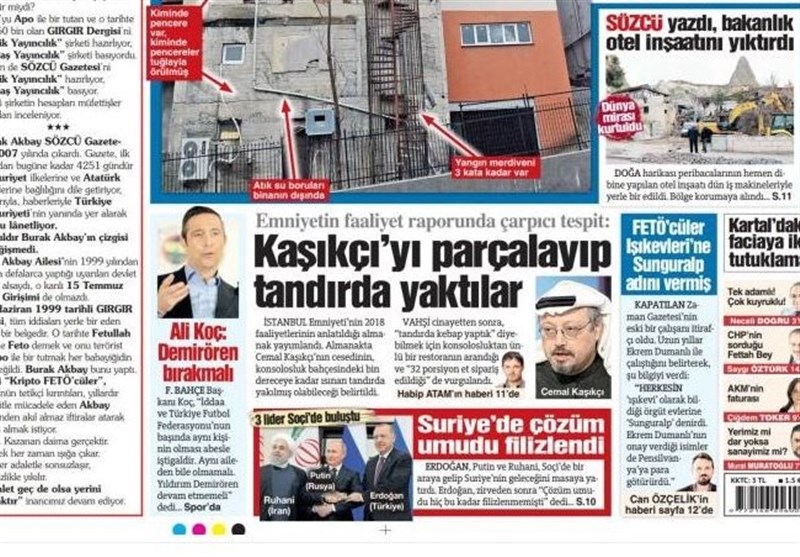 به گزارش گروه بینالملل خبرگزاری تسنیم، بسیاری از روزنامههای ترکیه، امروز در عکس و تیتر صفحه نخست، نشست سوچی را برجسته کردهاند. همچنین این روزنامهها موضوعات دیگری مانند شیوه قتل جمال خاشقجی را مورد توجه قرار دادند.