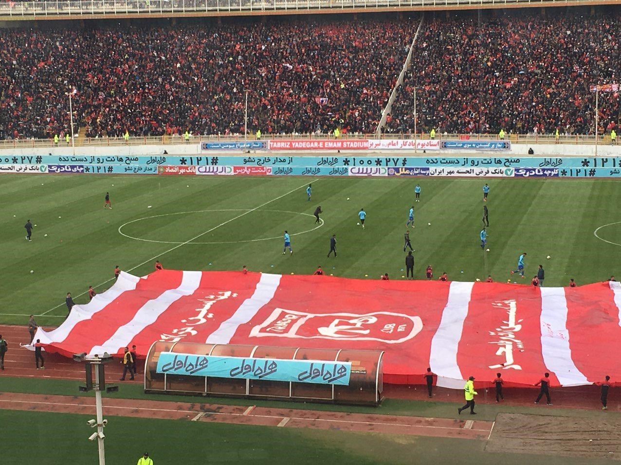 استقلالی‌های حاضر در ورزشگاه پرچم بزرگ استقلال را روی سکوها باز کردند که این موضوع واکنش تراکتوری‌ها را در پی داشت.