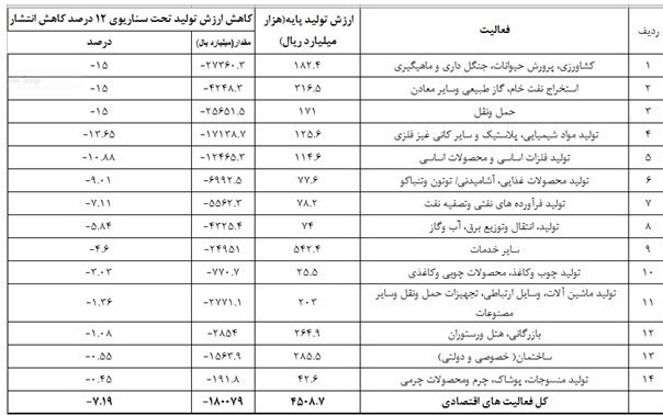 بر اساس این گزارش سازمان حفاظت محیطزیست، در صورت کاهش 12 درصدی انتشار گازهای گلخانهای، اقتصاد ایران با کاهش ارزش تولید به میزان 180078.8 میلیارد ریال بر اساس قیمتهای سال 83 مواجه خواهد شد همچنین بر طبق محاسبات صورت گرفته در این گزارش، این مقدار کاهش ارزش تولید، معادل کاهش 7.2 درصد از حجم کل اقتصاد کشور است؛ میزان متضرر شدن صنایع مختلف کشور از کاهش 12 درصدی انتشار گازهای گلخانهای را به تفکیک در جدول زیر آمده است: