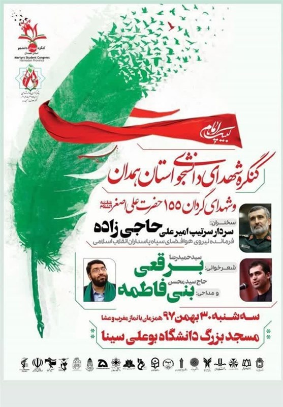 کنگره شهدای دانشجوی استان همدان و شهدای گردان 155 حضرت علیاصغر (ع) با شعر خوانی سید حمیدرضا برقعی و مداحی حاج سید محسن بنیفاطمه برگزار میشود.