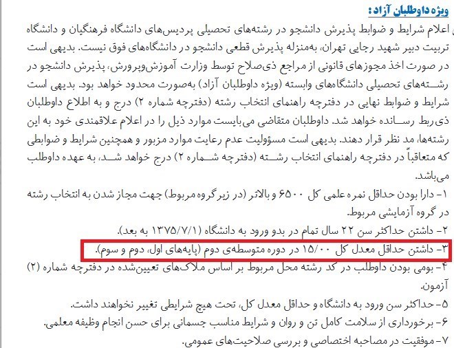 شرط معدل بعد از تصویب در مراجع ذیصلاح، زمان انتخاب رشته تحصیلی در "دفترچه شماره 2" جهت اطلاع داوطلبان درج و ملاک عمل قرار خواهد گرفت.
