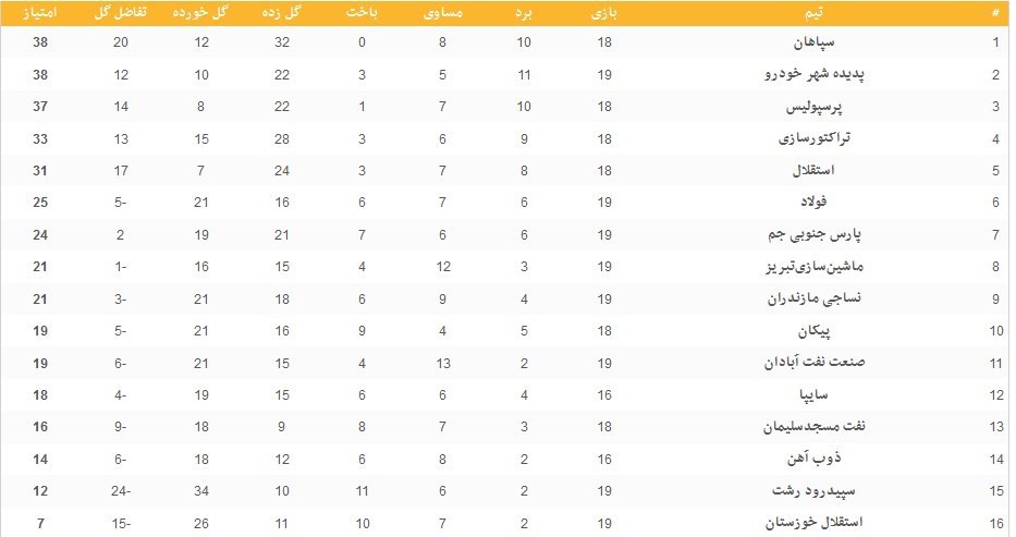 جدول لیگ برتر فوتبال در پایان روز دوم از هفته نوزدهم؛ صعود پیکان و نساجی و سقوط یک پله‌ای پرسپولیس
