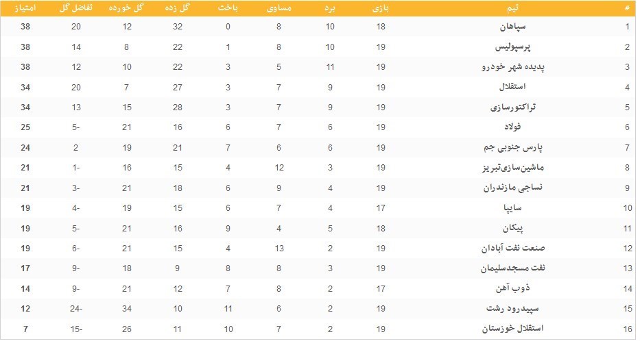 جدول ردهبندی لیگ برتر در پایان هفته نوزدهم در زیر آمده است: