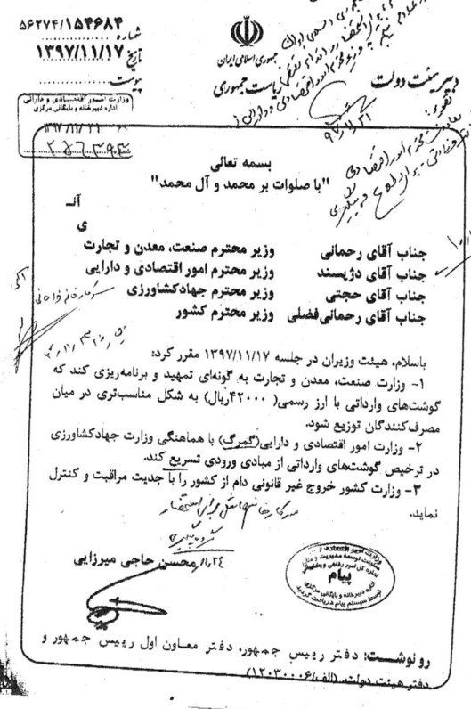 در ادامه این ابلاغیه خطاب به وزارت اقتصاد آمده است، با هماهنگی وزارت جهاد کشاورزی در خصوص ترخیص گوشتهای وارداتی تسریع کند.