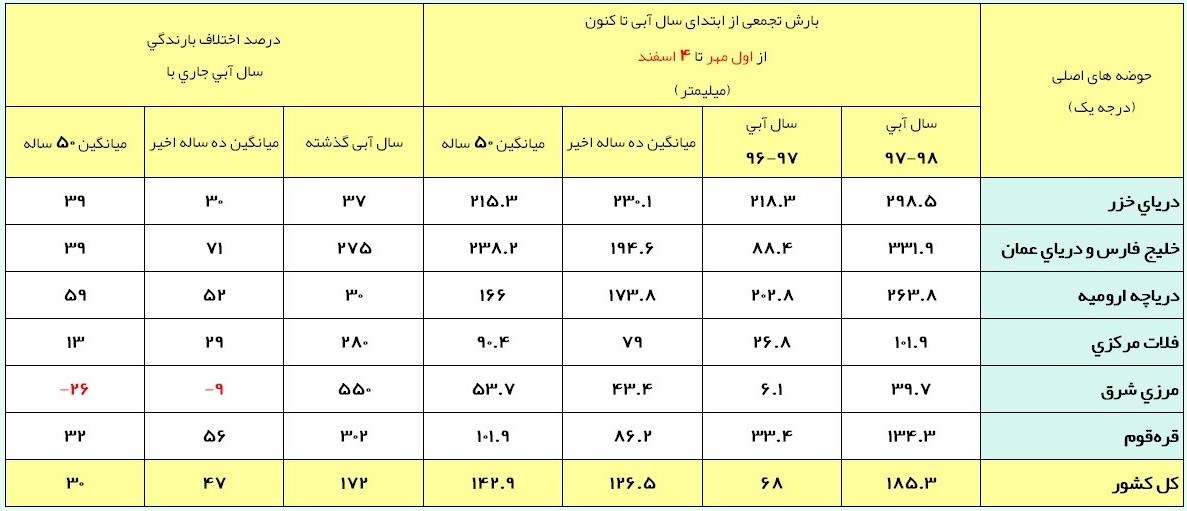 این مقدار بارندگی نسبت به میانگین دورههای مشابه درازمدت (142.9 میلیمتر) 30 درصد افزایش و نسبت به دوره مشابه سال آبی گذشته (68 میلیمتر) 172 درصد افزایش نشان میدهد.