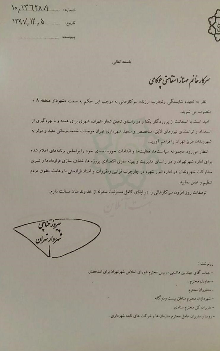 به گزارش خبرنگار اجتماعی خبرگزاری تسنیم؛ پیروز حناچی شهردار تهران طی احکامی جداگانه مهناز استقامتی چوکامی را به عنوان شهردار منطقه 8 تهران، رضا عباسی را بهعنوان شهردار منطقه 14، حسین بحیرایی را به عنوان شهردار منطقه 10 تهران و محمد محمددوست را بهعنوان شهردار منطقه 4 تهران منصوب کرد.