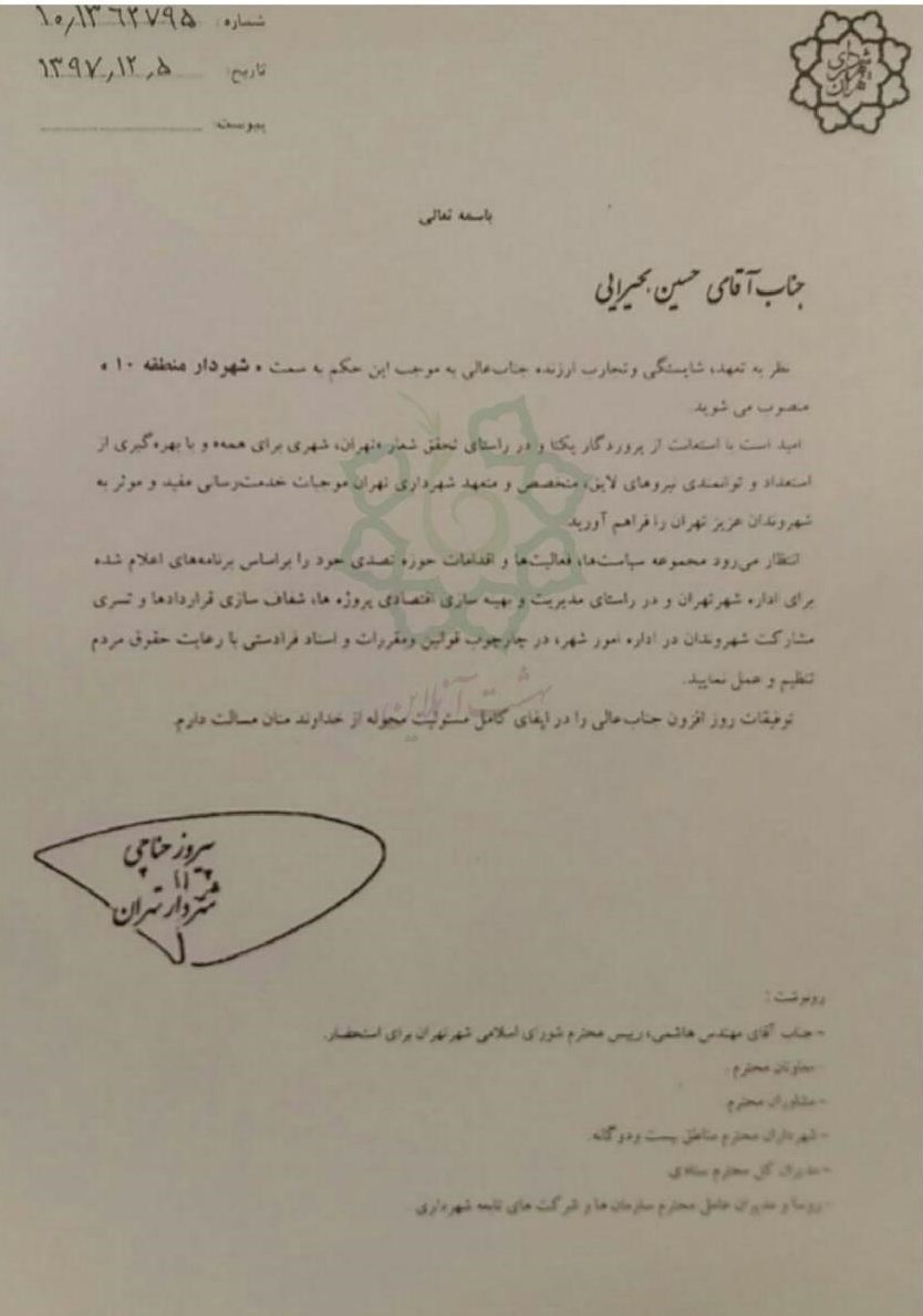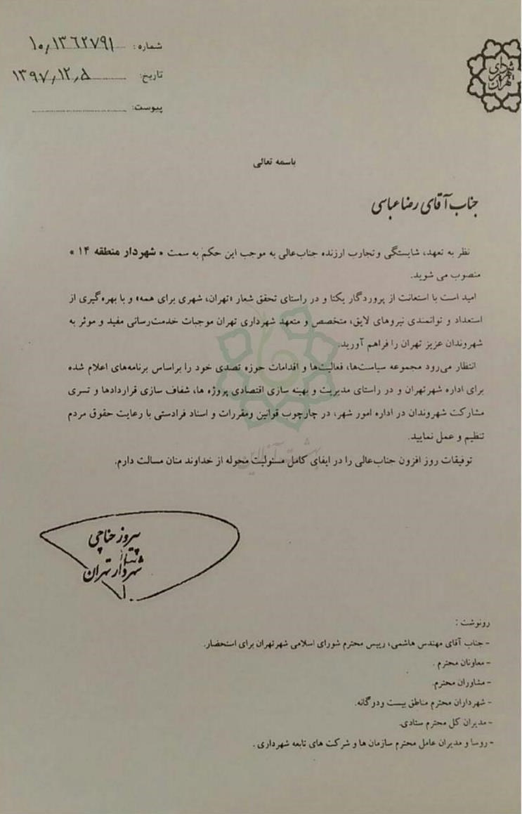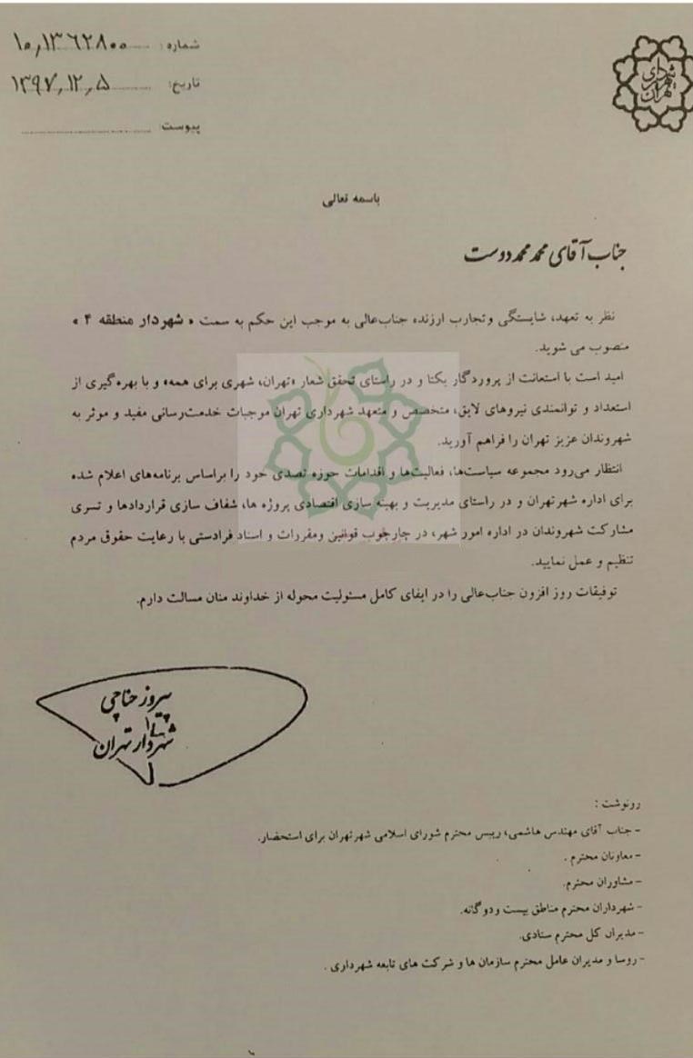 براساس این گزارش متن احکام 4 شهرداران مناطق 14،4،10 و 8 به شرح ذیل است: