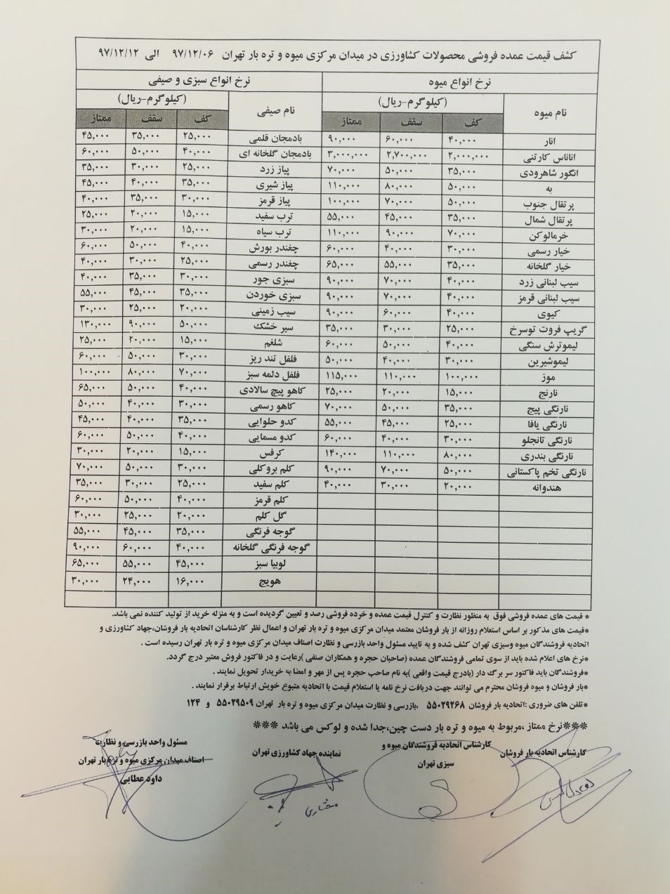 لیست کامل قیمت انواع میوه و تره بار به صورت عمده در میدان مرکزی میوه و تره بار در ذیل مطلب آمده است.