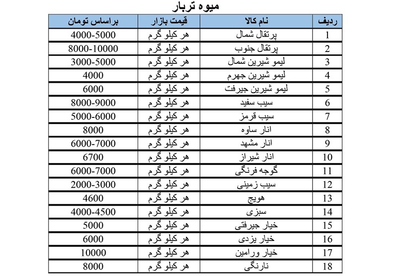 قیمت انواع میوه و تره‌بار و مواد پروتئینی در کرمانشاه؛ سه‌شنبه 7 اسفندماه + جدول