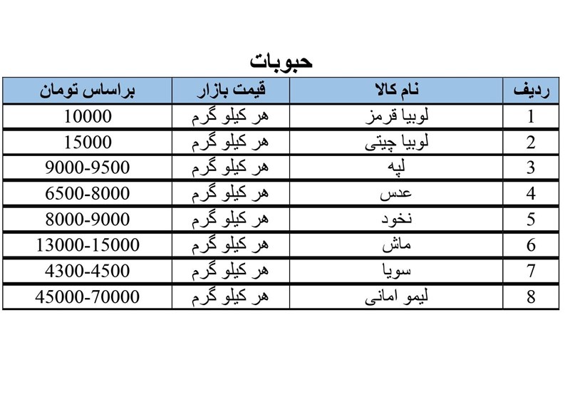 قیمت میوه, حبوبات و مواد پروتئینی در ارومیه; سه‌شنبه 7 بهمن‌ماه + جدول