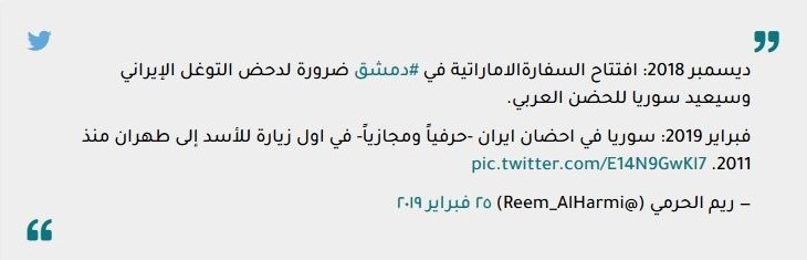 ریم الحرمی نویسنده عرب نیز نوشت: "دسامبر سال 2018: افتتاح سفارت امارات در دمشق ضرورتی برای جلوگیری از نفوذ ایران می شود و اینکه سوریه را به دامن جهان عرب بازخواهد گرداند. فوریه سال 2019: سوریه کاملا در دامن ایران با اولین سفر بشار اسد به تهران از سال 2011 میلادی است."