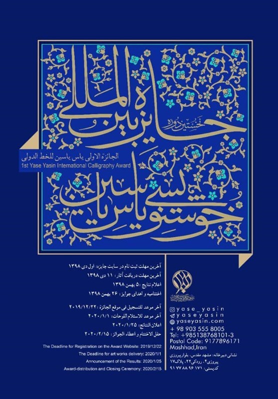 مدیر برگزاری جایزه بینالمللی خوشنویسی یاس یاسین ضمن اشاره به انتشار فراخوان این جایزه بینالمللی خوشنویسی یاس یاسین تاکید کرد: شرکتکنندگان میتوانند تا اول دی ماه سال 98 در این رویداد بین المللی شرکت کنند.