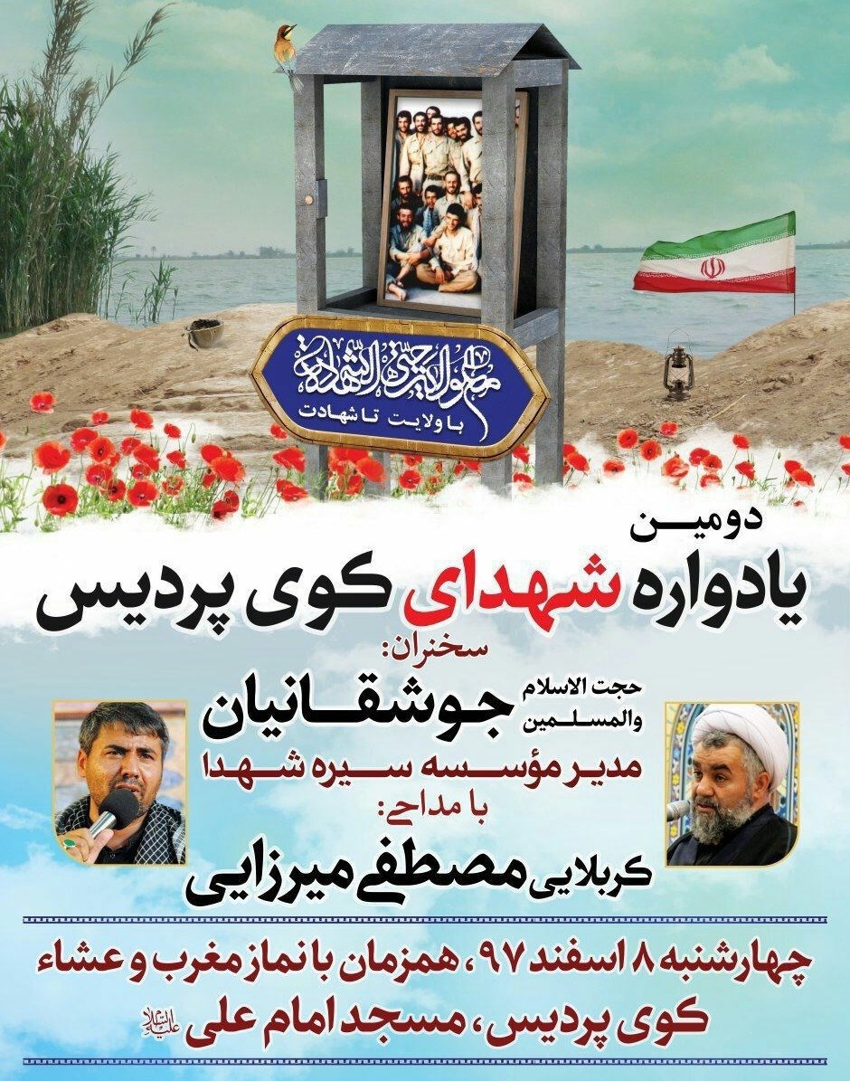 دومین یادواره شهدای کوی پردیس همدان هم امشب پس از اقامه نماز مغرب و عشا در مسجد امام علی(ع) برگزار شده و حجت الاسلام جوشقانیان، رئیس مؤسسه روایت سیره شهدا در آن سخنرانی میکند.