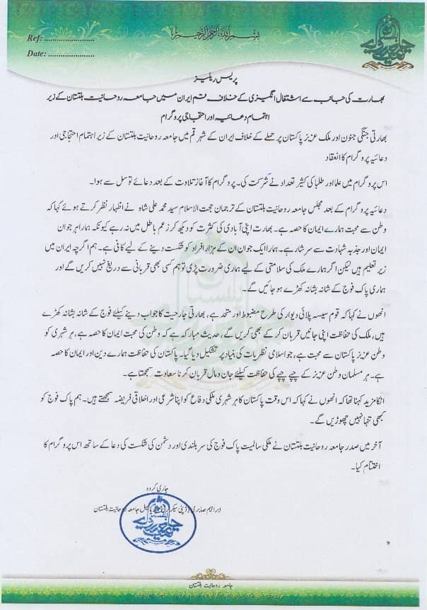 در بیانیه جامعه روحانیت بلتستان آمده است: تجاوز جنگندههای هندی به سرزمین پاکستان را به شدت محکوم کرده و اعلام میکنیم که هند نباید به رفتار خصمانه خود ادامه دهد.