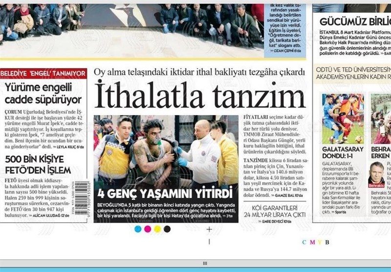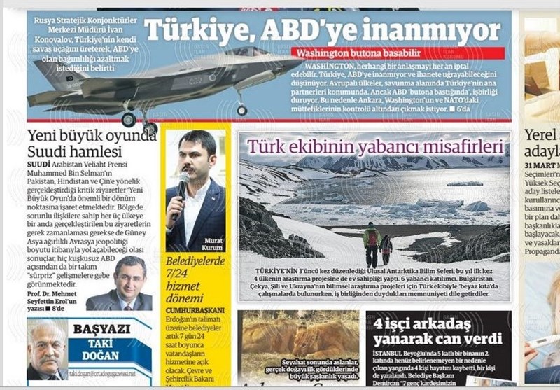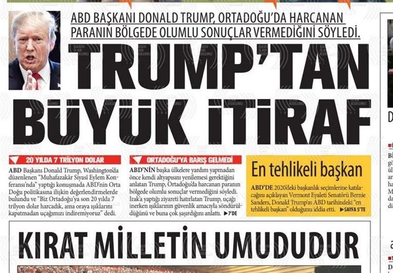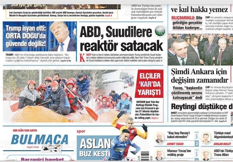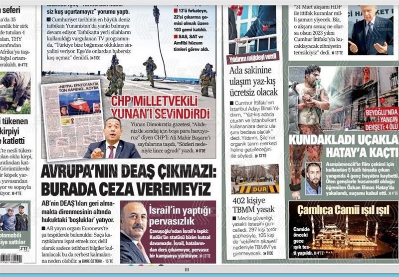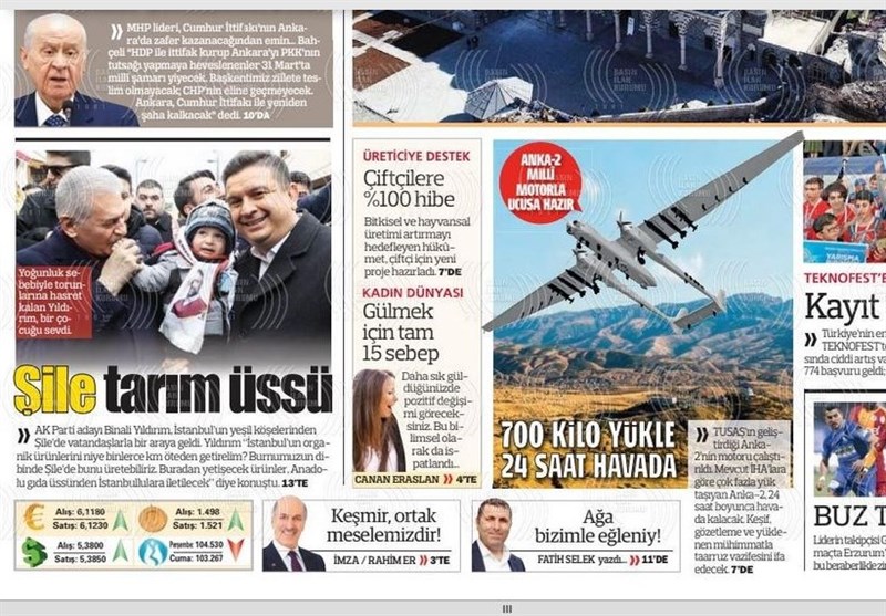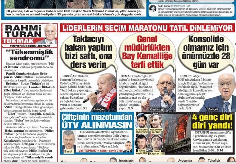 به گزارش گروه بینالملل خبرگزاری تسنیم، بسیاری از روزنامههای ترکیه، امروز در عکس و تیتر صفحه نخست، سخنان انتخاباتی اردوغان و حملات ائو به مخالفین را برجسته کردهاند. همچنین این روزنامهها موضوعات دیگری مانند تولید نسل جدید هواپیماهای بدون سرنشین ترکیه را مورد توجه قرار دادهاند.