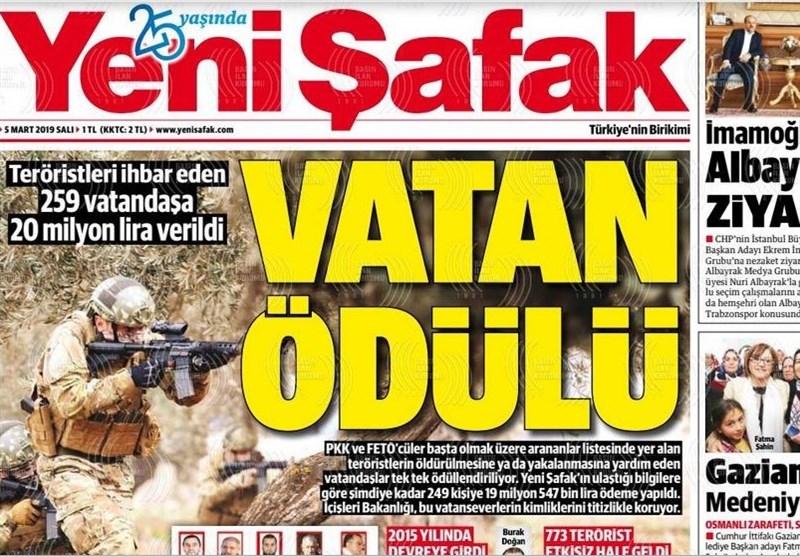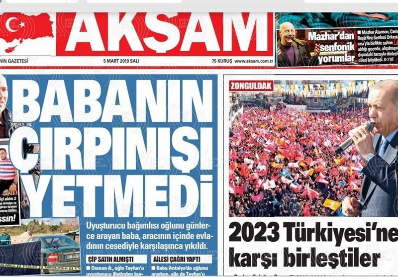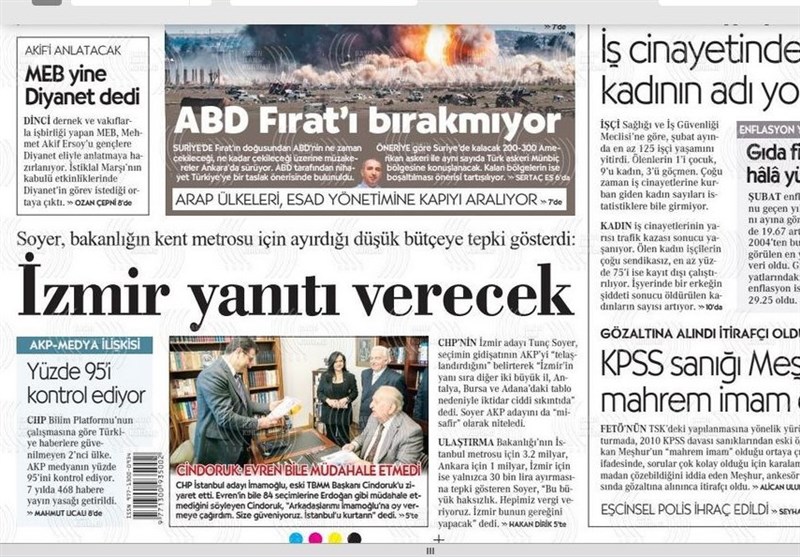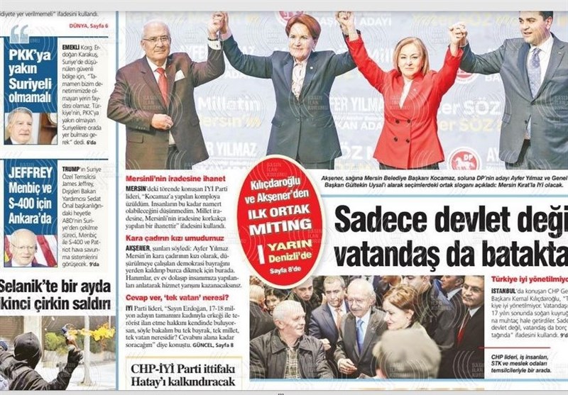 به گزارش گروه بینالملل خبرگزاری تسنیم، بسیاری از روزنامههای ترکیه، امروز در عکس و تیتر صفحه نخست، سخنان اردوغان خطاب به هواداران حزب جمهوری خلق را برجسته کردهاند. همچنین این روزنامهها موضوعات دیگری مانند سفر جیمز جفری به ترکیه را مورد توجه قرار دادهاند.