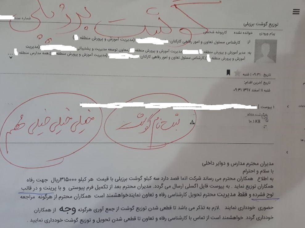 به گزارش خبرنگار اجتماعی خبرگزاری تسنیم، بخشنامهای به ادارات آموزشوپرورش شهر تهران ارسال شده است که از توزیع گوشت منجمد برزیلی بین فرهنگیان خبر میدهد.