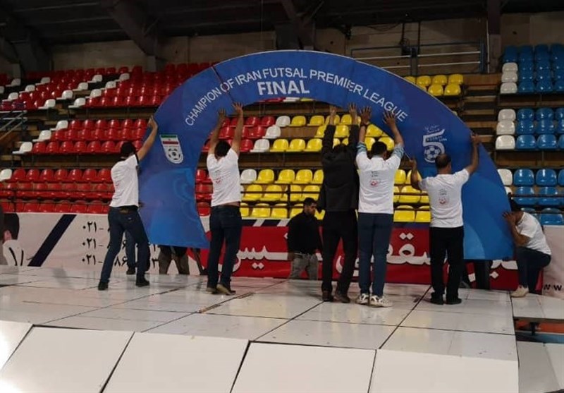 سکوی قهرمانی لیگ برتر فوتسال پیش از آغاز بازی بار دیگر در ورزشگاه نصب و تست شد.