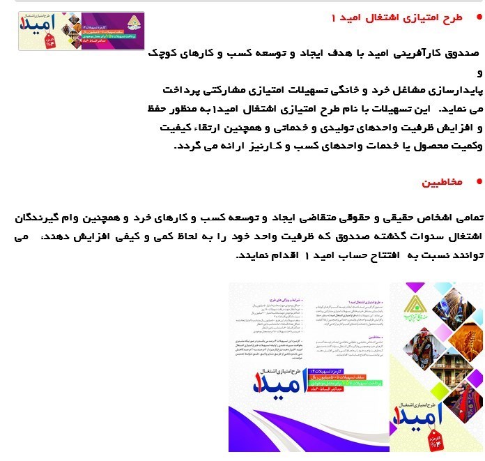 صندوق کارآفرینی امید با هدف ایجاد و توسعه کسب و کارهای کوچک و پایدار سازی مشاغل خرد و خانگی تسهیلات امتیازی مشارکتی پرداخت می نماید. این تسهیلات با نام طرح امتیازی اشتغال امید 1به منظور حفظ و افزایش ظرفیت واحدهای تولیدی و خدماتی و همچنین ارتقاء کیفیت و کمیت محصول یا خدمات واحدهای کسب و کار نیز ارائه می شود.