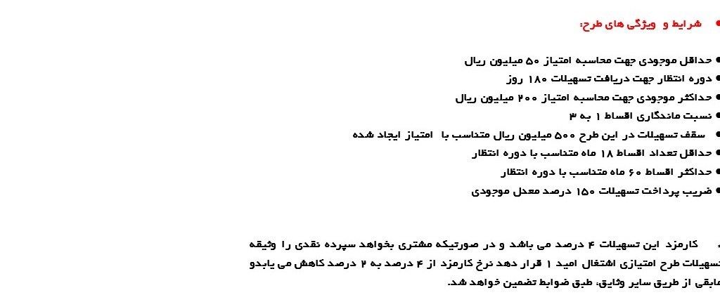 شرایط و ویژگیهای طرح به این صورت است که حداقل موجودی جهت محاسبه امتیاز 50 میلیون ریال،دوره انتظار جهت دریافت این تسهیلات 180 روز و حداکثر موجودی جهت محاسبه امتیاز 200 میلیون ریال، نسبت ماندگاری اقساط 1به 3،سقف تسهیلات در این طرح 500 میلیون ریال متناسب با امتیاز ایجاد شده، حداقل تعداد اقساط 18ماه متناسب با دوره انتظار و حداکثر اقساط 60 ماه متناسب با دوره انتظار و ضریب پرداخت تسهیلات 150 درصد معدل موجودی است.