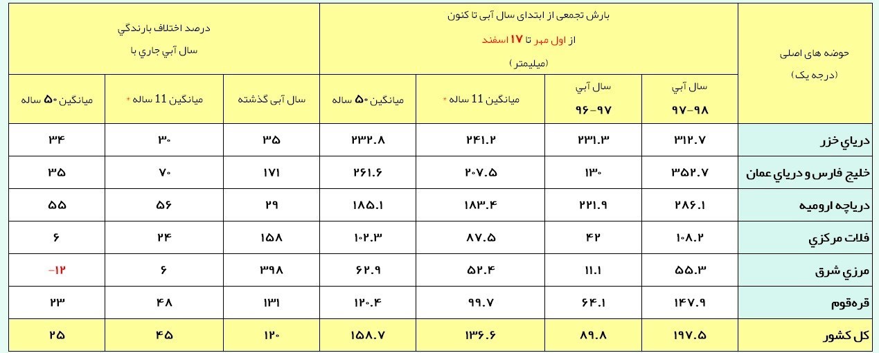 این مقدار بارندگی نسبت به میانگین دورههای مشابه درازمدت (158.7 میلیمتر) 25 درصد افزایش و نسبت به دوره مشابه سال آبی گذشته (89.8 میلیمتر) 120 درصد افزایش نشان میدهد.