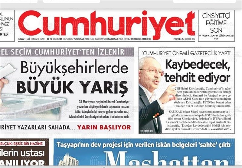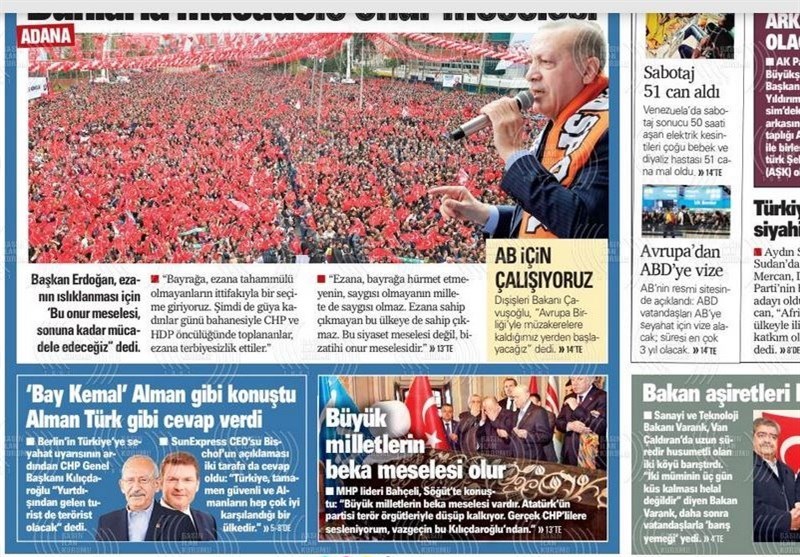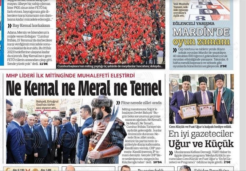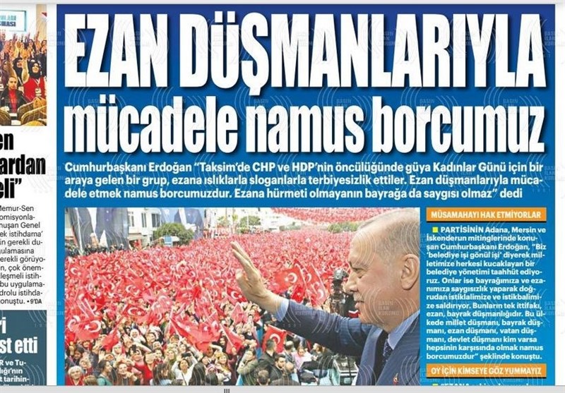 به گزارش گروه بینالملل خبرگزرای تسنیم، بسیاری از روزنامههای ترکیه، امروز در عکس و تیتر صفحه نخست، واکنش تند اردوغان و باغچلی به مواضع سیاسی ائتلاف را برجسته کرده و آنان را دشمنان اذان و بیرق نامیدهاند.
