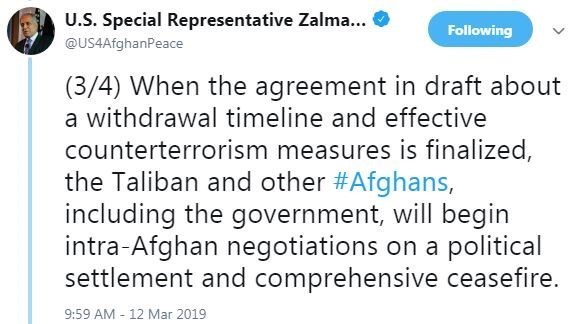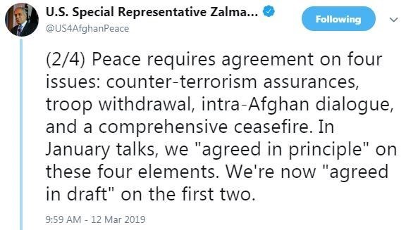 خلیلزاد که رهبری هیئت مذاکره کننده آمریکا را نیز در گفتوگو با طالبان بر عهده دارد در توئیتی نوشت: «صلح نیازمند توافق روی 4 مسئله است که تضمینها درباره مبارزه با تروریسم، خروج نیروها، گفتوگوهای بینالافغانی و توافق جامع برای صلح».