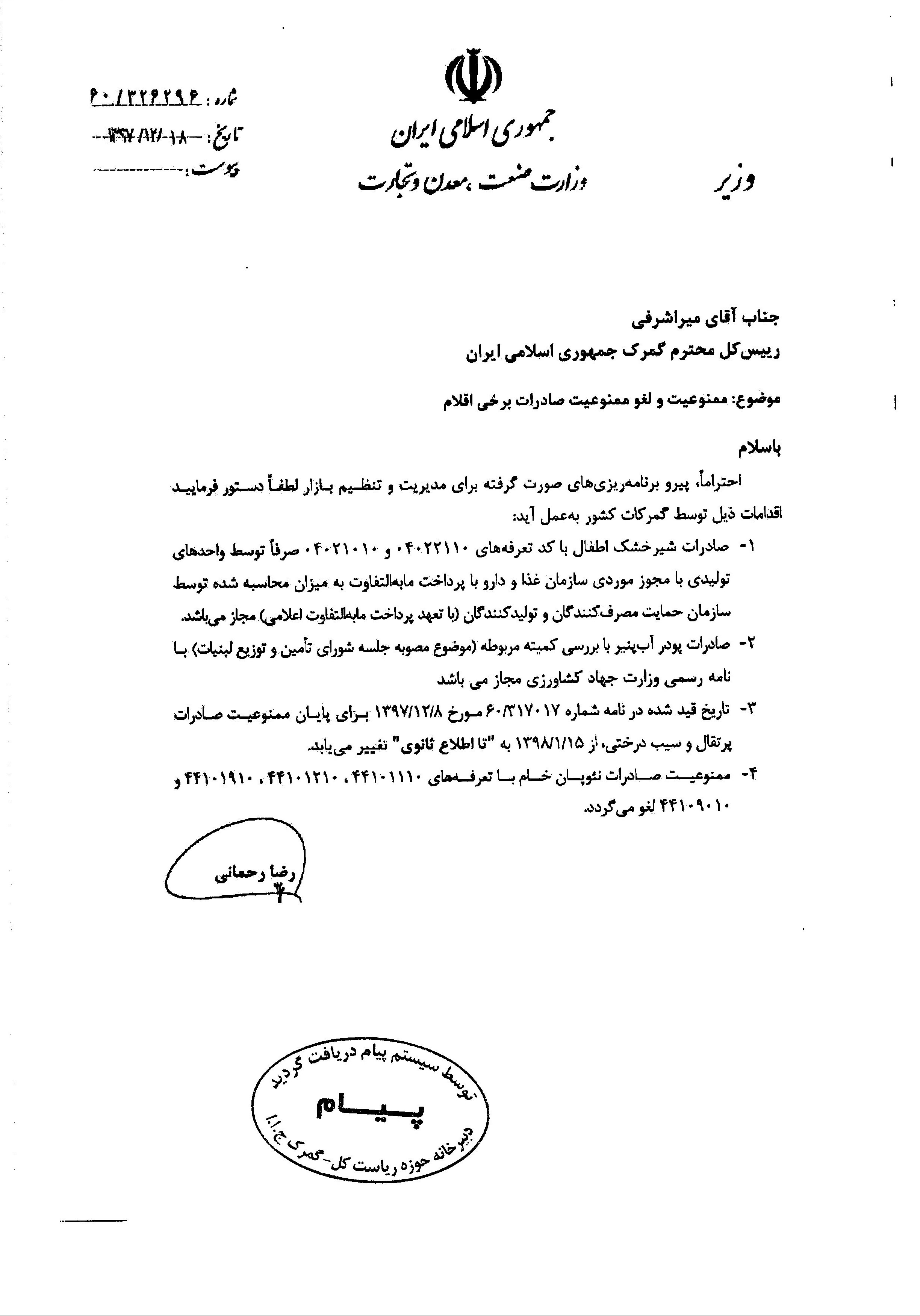 به گزارش خبرنگار اقتصادی خبرگزاری تسنیم، رحمانی وزیر صنعت، معدن و تجارت با ارسال نامهای به میراشرفی رئیس گمرک، ممنوعیت و لغو ممنوعیت صادرات برخی از اقلام شامل شیرخشک کودکان، آب پنیرو نئوپان را اعلام کرد.