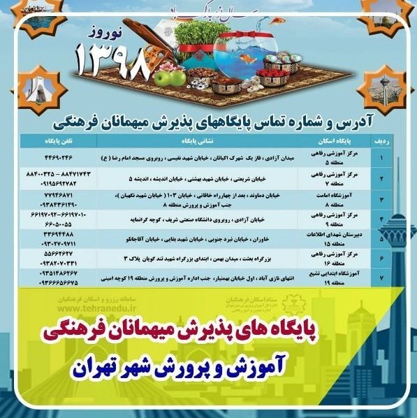 در ذیل میتوانید آدرس مراکز اسکان شهر تهران در ایام نوروز 98 را مشاهده کنید.